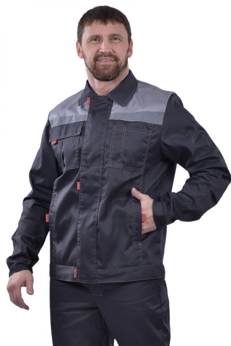Два нижних кармана расположены в рельефных швах. Рукава с манжетами на пуговицу, с налокотниками.